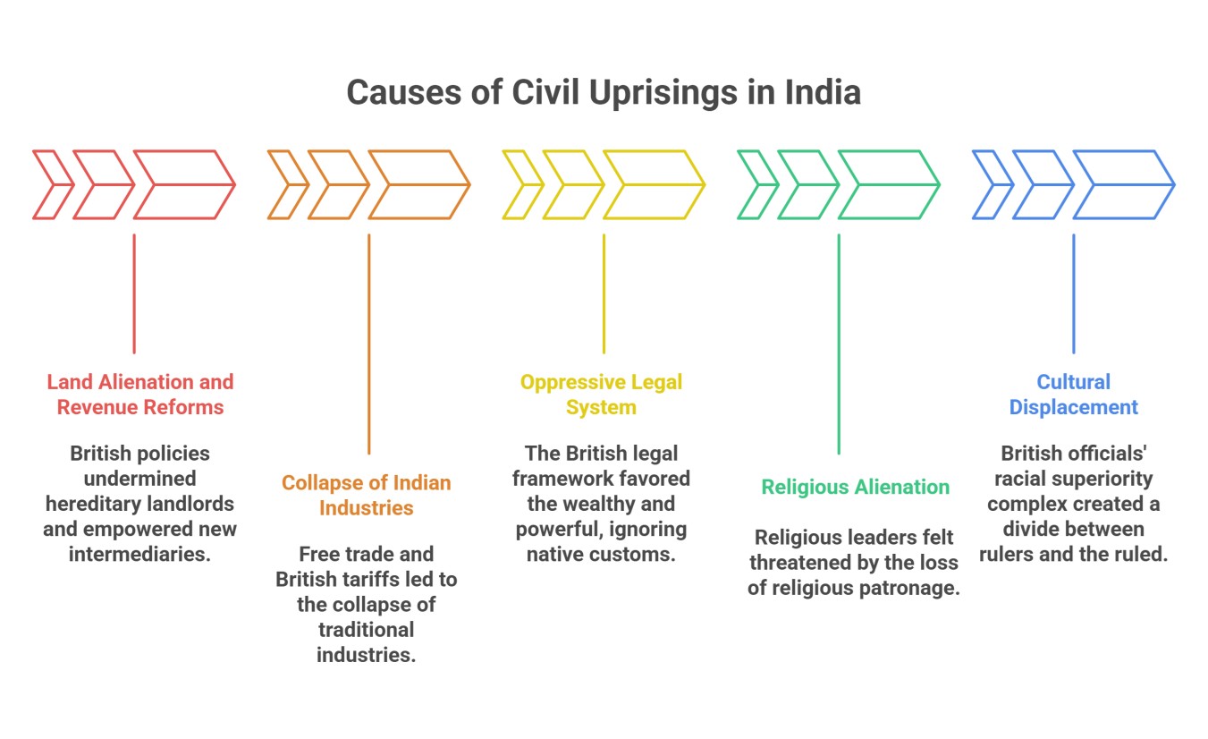 The first century of British rule in India witnessed a torrent of localized but fierce civil uprisings. These movements were primarily driven by socio-economic distress, betrayal of treaties, and displacement of traditional rulers and zamindars. Although not coordinated under a national umbrella, these revolts reflected the growing resentment among different sections of Indian society, from peasants and zamindars to tribal leaders and dispossessed royals.
