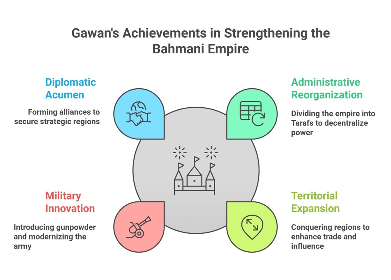• Military innovation: He introduced the use of gunpowder in warfare and invited Persian chemists to train the Bahmani army in its application, significantly modernizing their military capabilities.