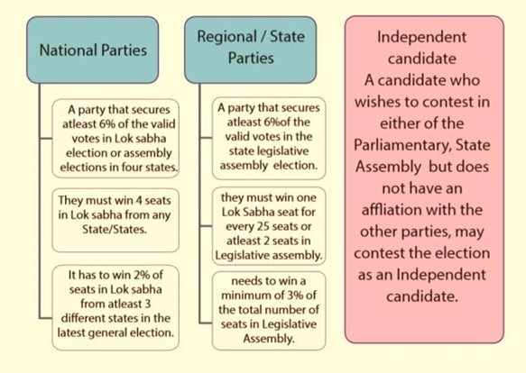 1. The party secures 6% of valid votes in four or more states during a general election to the Lok Sabha or the legislative assembly, and additionally wins four seats in the Lok Sabha from any state or states.